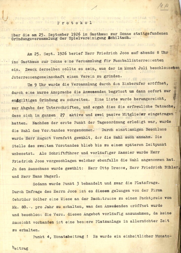 Die SpVgg 1926 Schiltach e.V. wurde offiziell am 25.09.1926 gegründet – allerdings wurde schon viele Jahr zuvor in Schiltach gekickt und eine Vereinsgründung angestrebt – der Erste Weltkrieg hat eine frühere Gründung wohl verhindert..